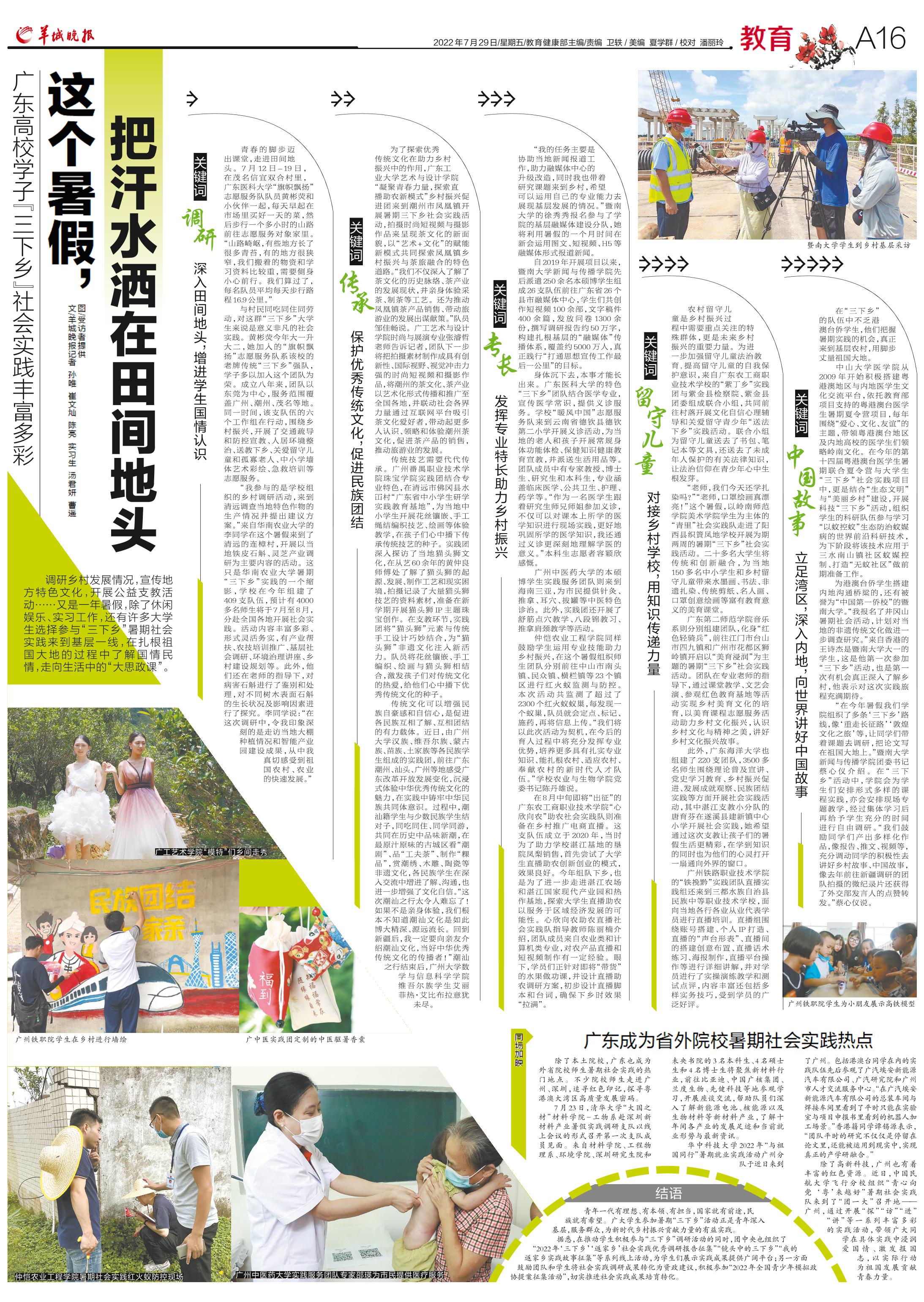 “在今年暑假我们学院组织了多条‘三下乡’路线,像‘重走长征路’‘敦煌文化之旅’等,让同学们带着课题去调研,把论文写在祖国大地上。”暨南大学新闻与传播学院团委书记蔡心仪介绍。在“三下乡”活动中,学院会为学生们安排形式多样的课程实践,亦会安排现场专题教学,经过集体学习后再给予学生充分的时间进行自由调研。“我们鼓励同学们产出多样化作品,像报告、推文、视频等,充分调动同学的积极性去讲好乡村故事、中国故事,像去年前往新疆调研的团队拍摄的微纪录片还获得了外交部发言人的点赞转发。”蔡心仪说。