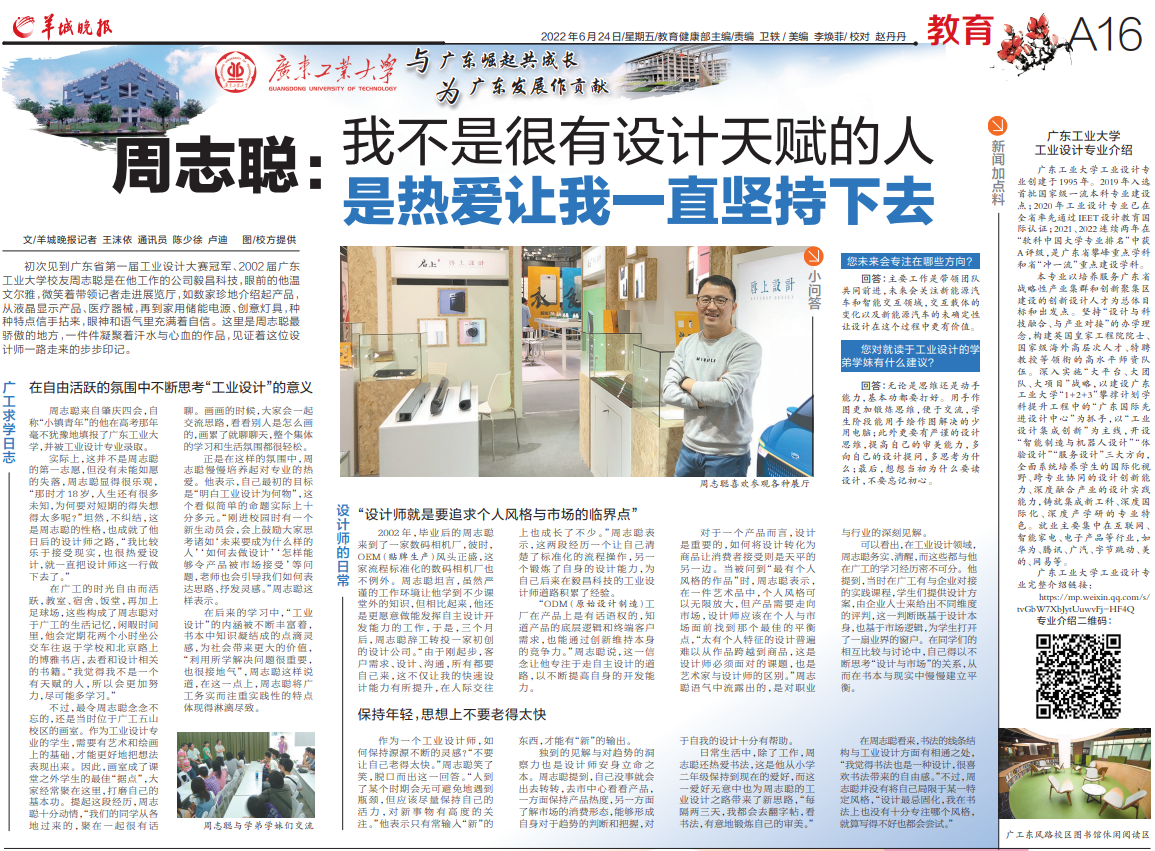正是在这样的氛围中,周志聪慢慢培养起对专业的热爱。他表示,自己最初的目标是“明白工业设计为何物”,这个看似简单的命题实际上十分多元。“刚进校园时有一个新生动员会,会上鼓励大家思考诸如‘未来要成为什么样的人’‘如何去做设计’‘怎样能够令产品被市场接受’等问题,老师也会引导我们如何表达思路、抒发灵感。”周志聪这样表示。