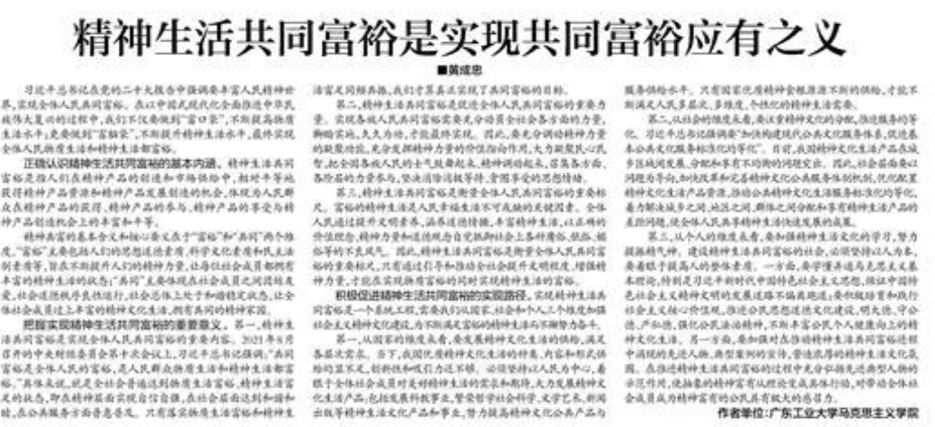 精神共富的基本含义和核心要义在于“富裕”和“共同”两个维度。“富裕”主要包括人们的思想道德素质、科学文化素质和民主法制素质等,旨在不断提升人们的精神力量,让每位社会成员都拥有丰富的精神生活的状态;“共同”主要体现在社会成员之间团结友爱,社会道德秩序良性运行,社会总体上处于和谐稳定状态,让全体社会成员过上丰富的精神文化生活,拥有共同的精神家园。