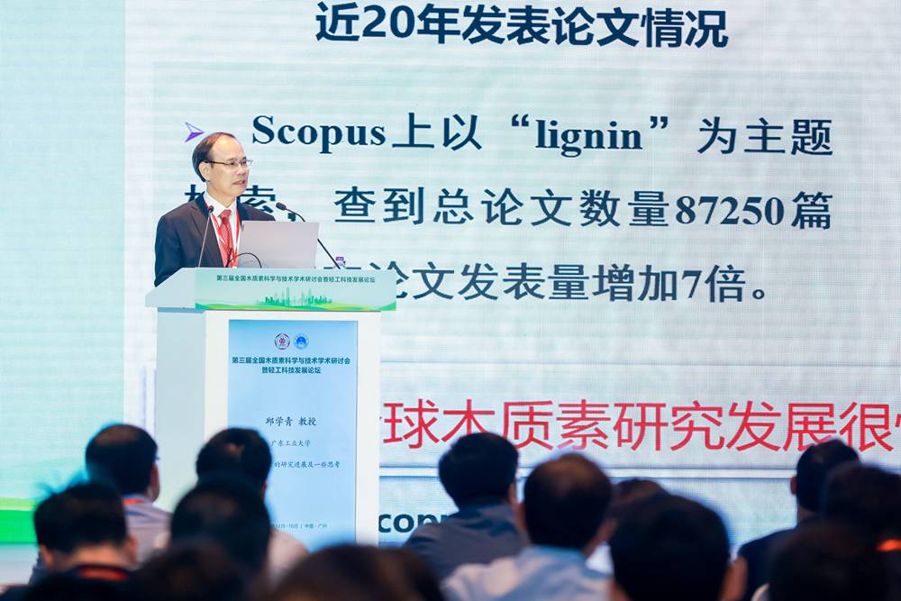 “习近平总书记视察广东重要讲话、重要指示,为高校在新征程中更好推进中国式现代化的广东实践指明了前进方向、提供了根本遵循,高校要坚持立德树人根本任务,充分发挥创新人才培养主阵地的作用,推动科研和育人紧密结合。”邱学青指出,大会为木质素领域专家学者与师生提供了重要的交流平台,进一步推动了高素质化工创新人才的培养。据悉,相比过往两届木质素会议,本届会议的规模与影响力显著扩大,吸引了众多业内大咖参与,反响热烈,显著推动了国内外木质素研究的发展。邱学青表示,必须坚定“加快实现高水平科技自立自强,是推动高质量发展的必由之路”的理论自信,深入开展木质素资源高值化利用方面的研究;必须坚持创新,不断向木质素研究领域的广度和深度进军;必须坚持夯实基础研究,突破关键核心技术问题,推动成果转化与工业化应用。“‘木质素人’要保持踔厉奋发笃行不怠的奋斗精神,推动木质素研究迈上新的台阶,深入优化产业结构,助力绿色低碳高质量发展。”邱学青说。