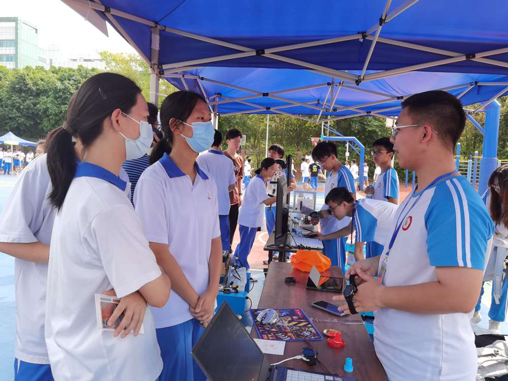 无人机炫酷飞行表演、无人车灵巧穿梭避让、机械臂轻松抓取物品等科技展演引人入胜,吸引了参加科技节的师生及家长驻足展位操作实物,与团队学生互动交流;高端装备制造、前沿新材料、新能源等一批支撑广东战略新兴产业发展和助力国家海洋强国战略实施的创新项目展示更是让中学生拓宽了未来技术创新视野,激发了科技强国使命。