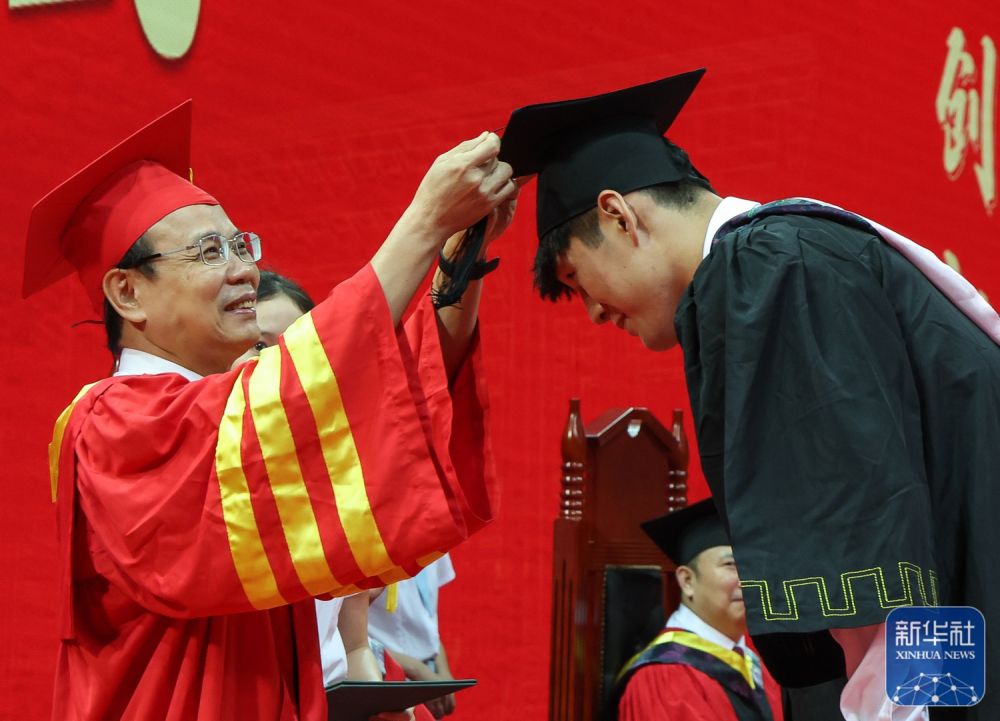 ↑6月28日,万搏网页_万搏(中国)校长邱学青(左)为陈国豪拨穗。