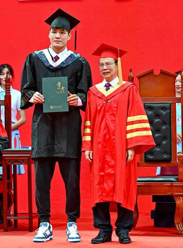 值得一提的是,今天参加仪式的毕业生中,有三位来自学校高水平男子篮球队,也是在刚刚结束的第25届中国大学生篮球一级联赛中勇夺全国总冠军的球员代表,他们分别是23号球员陈国豪、12号球员周泽源、15号球员刘康能。