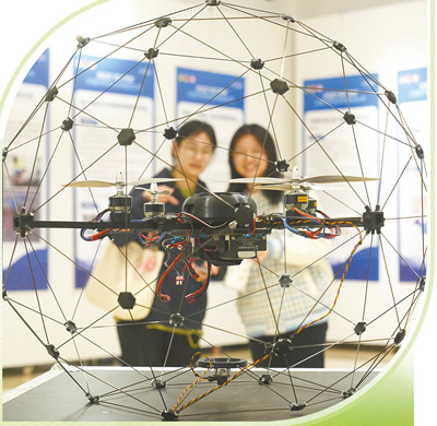 2023年川渝大学生科技创新文化节,大学生在观看室内无人机。