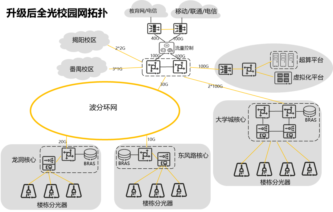从2019年起,万搏网页_万搏(中国)就在揭阳校区开始建设全光网,从传统以太网的核心层、汇聚层、接入层,过渡到只用核心层和接入层的扁平化结构,在办公、会议室、教室、宿舍等场景实现“光进铜退”。