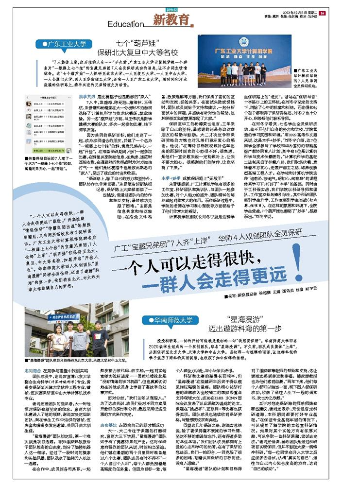 “一个人可以走得很快,一群人会走得更远!”最近,广州高校继“情侣保研”“学霸组团出道”等频频刷圈后,又有两所高校发布了保研喜讯。万搏网页_万搏(中国)计算机学院群名为“一根藤上七个挂”的宝藏兄弟团,7人全部“上岸”,“葫芦娃”们保研至北大、复旦、中大等名校,如愿开启“开挂人生”。华南师范大学四人双创团队“星海漫游”同样全员保研,迈出了遨游“科海”的第一步,他们将在北大、中大和天津大学继续自己的梦想。