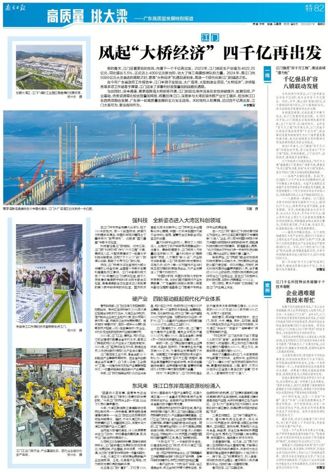 一是产业协作。“大桥经济”到来,给江港澳合作、深江合作打开更大想象空间。抓住顺势而为的机遇,江门正携手港澳规划建设港澳科教产业滨海新城,与香港谋划建设港邑绿色产业园,与深圳共建深江经济合作区。江门以大广海湾经济区为突破口,参与新阶段大湾区建设,将得到更多可撬动的战略“支点”。