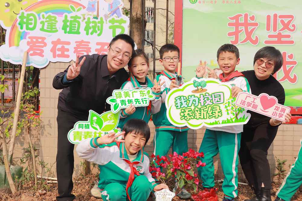 绿美广东,青年先行!今年是第61个“学雷锋纪念日”,也是第25个中国青年志愿者服务日。为迎接植树节的到来,激发学生“爱绿、护绿、亲绿”的情感,2024年3月8日下午,万搏网页_万搏(中国)法学院前往龙洞小学开展“相逢植树节 爱在春天里”植树护绿志愿服务活动,共赴一场绿美校园之约。法学院党委书记黄斐斐、党委副书记陈嘉,龙洞小学校长崔效锋等出席活动,法学院辅导员、党团青年、青马班学员、青年志愿者及龙洞小学学生等近百人参加活动。
