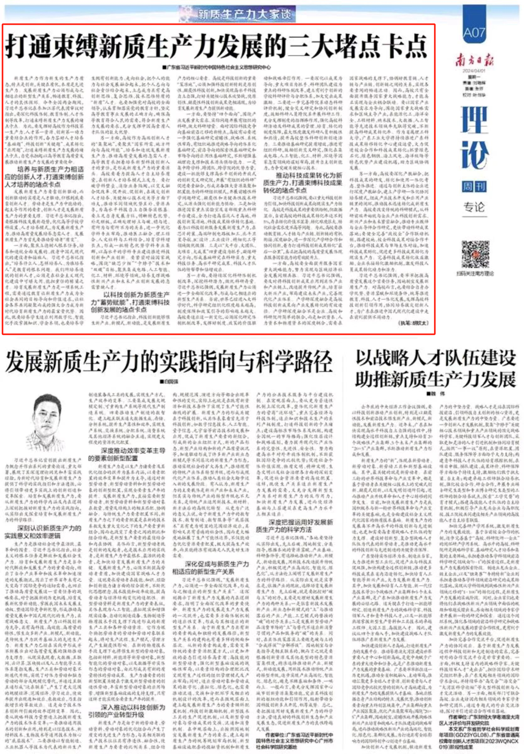 习近平总书记强调,要牢牢把握高质量发展这个首要任务,因地制宜发展新质生产力。对高校而言,也要结合自身办学优势、资源禀赋和环境条件,统筹推进教育、科技、人才一体化发展,发挥高校科技创新引领作用,协同培养拔尖创新人才,为广东在推进中国式现代化建设中走在前列提供不竭动力。