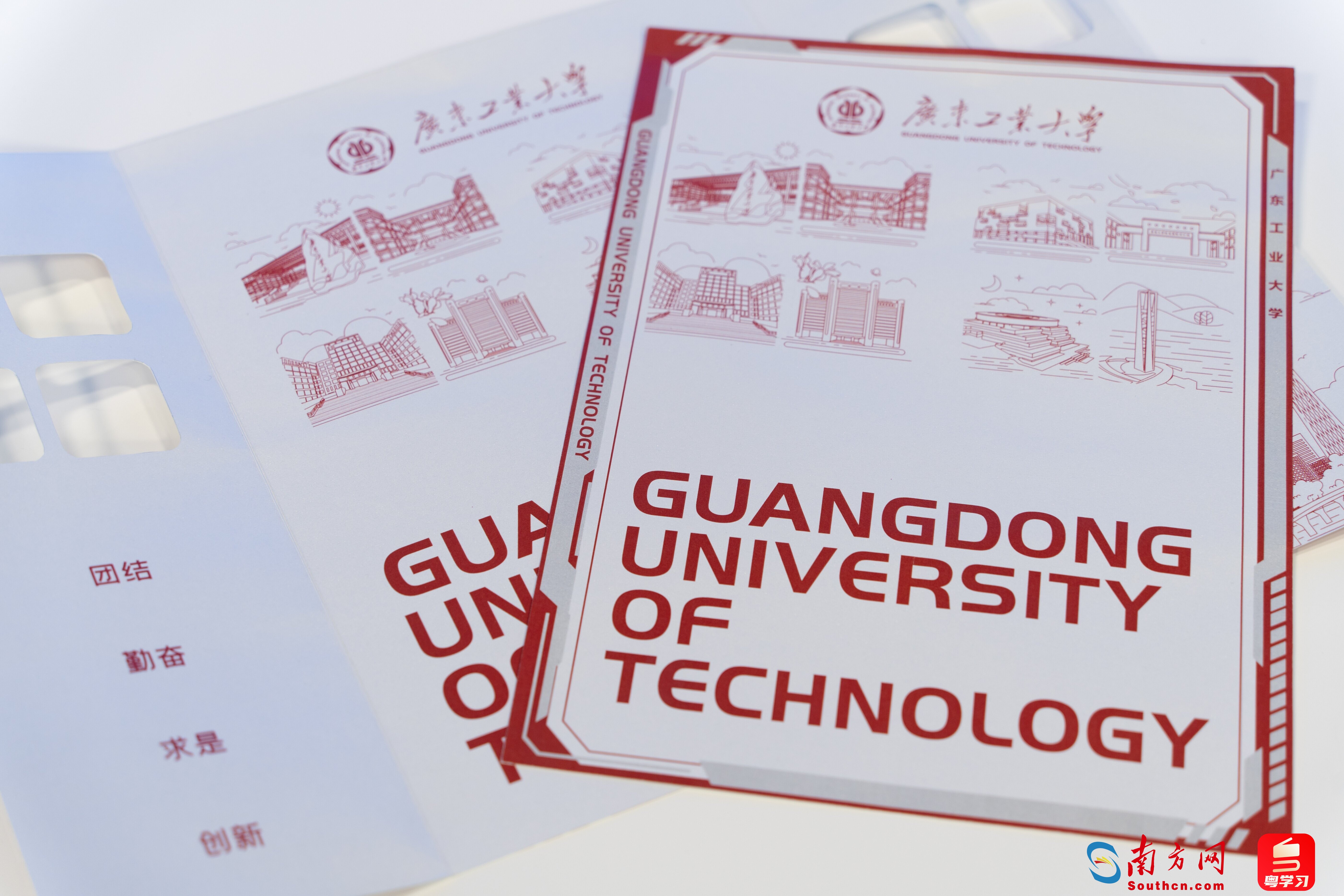 新款录取通知书分为封套和内页两部分。封套为开门开窗式设计,对应内页六大校区手绘标志性建筑,展现校区各有特色、协同发展。打开封套,右侧展示学校“与广东崛起共成长,为广东发展作贡献”的办学理念。