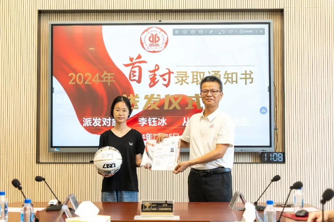 来自广州市从化区从化中学的李钰冰同学收到了这份特别的礼物,她以广工本省物理类最高分622分的成绩,被电气工程及其自动化专业录取。广工招生办公室、自动化学院相关领导和老师向李钰冰及其家人表达了祝贺,为她颁发录取通知书,并赠送电气专业相关书籍和易建联签名纪念款篮球。