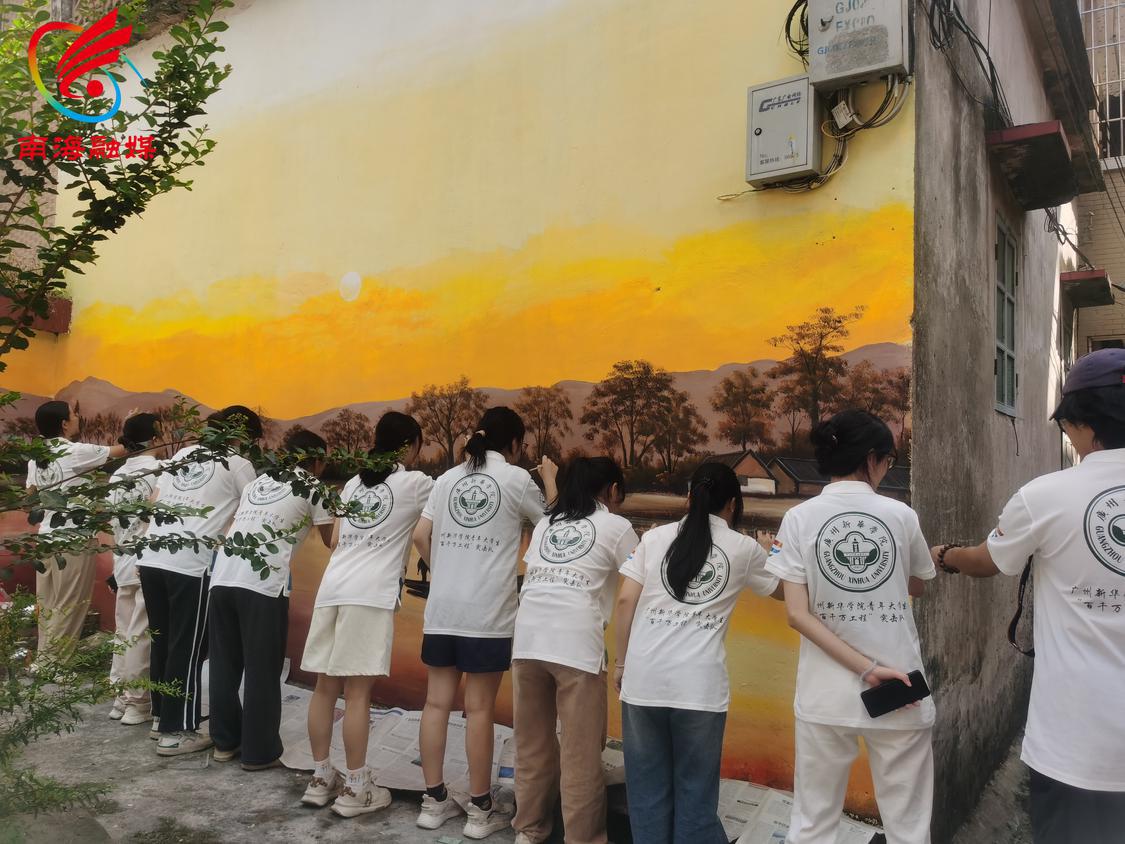 广州新华学院“一米绿韵”突击队与里水镇布新村结对,开展墙绘美化实践活动。