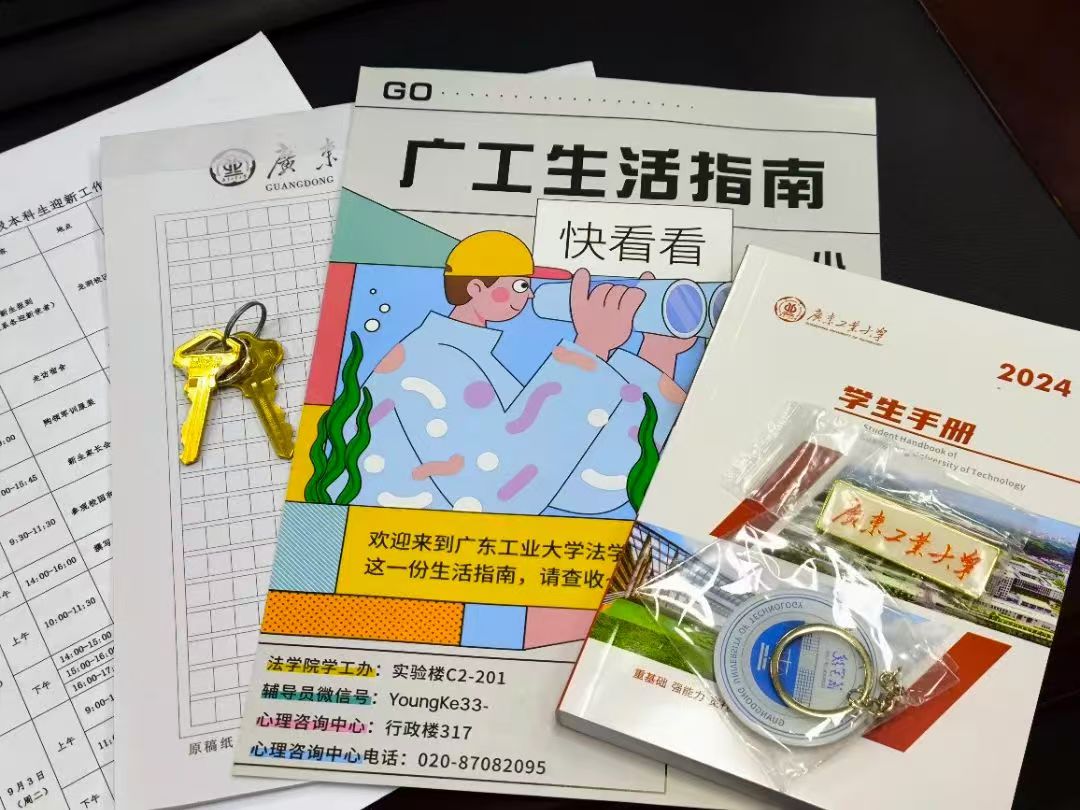 广工揭阳校区设计了新生签名墙和打卡点,准备了专属扇子、明信片、日历、鼠标垫等小礼物;材料与能源学院精心准备了新生慰问礼包,为当天生日的同学定制蛋糕,赠予新生特制笔筒;计算机学院准备了新生专属礼包袋以及计算机专属卡套等,用所有新生名字设计了“我爱计算机”迎新展板;自动化学院、轻工化工学院、法学院、信息工程学院、物理与光电工程学院等为新生赠送定制钥匙扣、帆布袋、明信片、特色地标卡片、广工生活指南等;国际教育学院编写个性化双语入学祝福;集成电路学院举办了新生趣味定向越野活动;土木与交通工程学院以“增加专业归属感”为主线为新生配备“引路人”校友班主任等等,点滴心意暖人心。