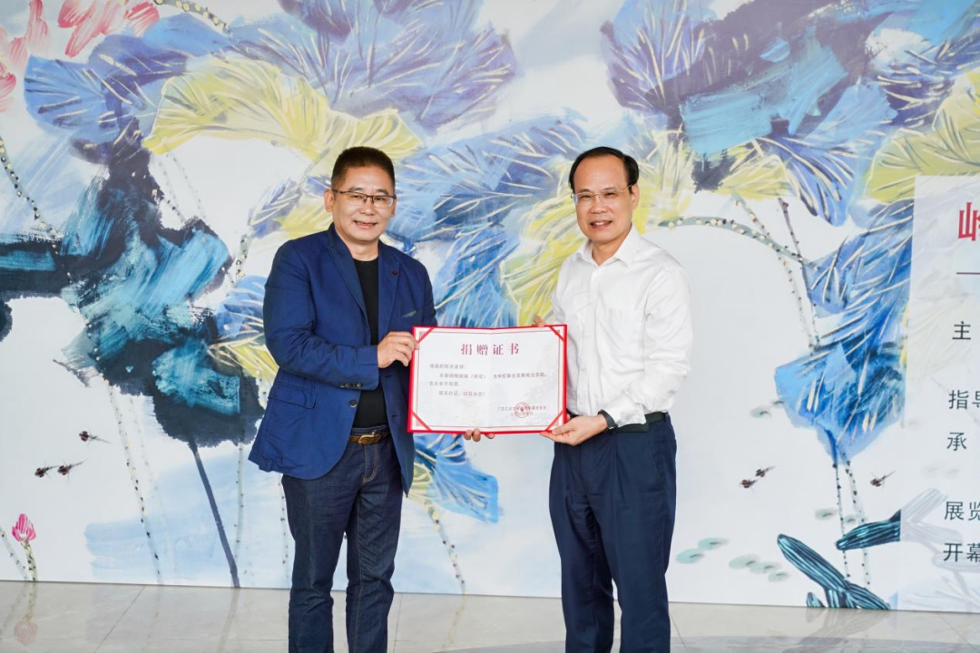 开幕式上,万搏网页_万搏(中国)校长邱学青代表学校接受了陈天捐赠的画作《荷花》并颁发捐赠证书。画作中莲叶碧绿接天连地、荷花怒放亭亭玉立,表达了对祖国繁荣昌盛、欣欣向荣的美好祝福。
