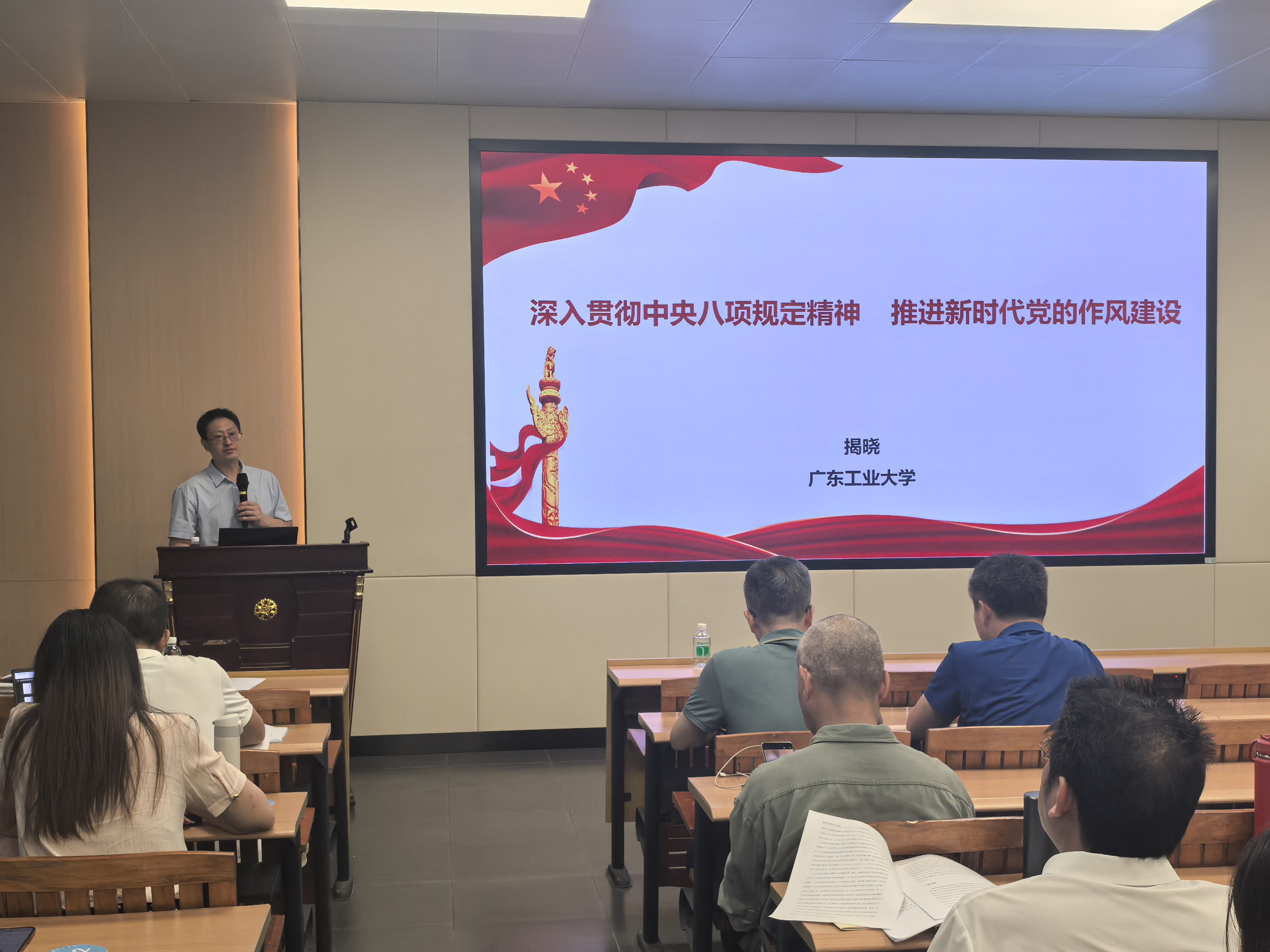 作风建设强党性。学院邀请学校马克思主义学院院长揭晓教授作专题讲座。揭晓教授以《深入贯彻中央八项规定精神,推进新时代党的作风建设》为题,从中央八项规定精神的背景及意义、中央八项规定精神的内容及成效、坚持不懈推进新时代党的作风建设三个层面展开深入分析,他指出要以深入贯彻中央八项规定精神学习教育为契机,认真学习习近平总书记关于加强党的作风建设的重要论述,树立正确的权力观、政绩观、事业观,为实现中华民族伟大复兴伟业营造风清气正的良好政治生态。