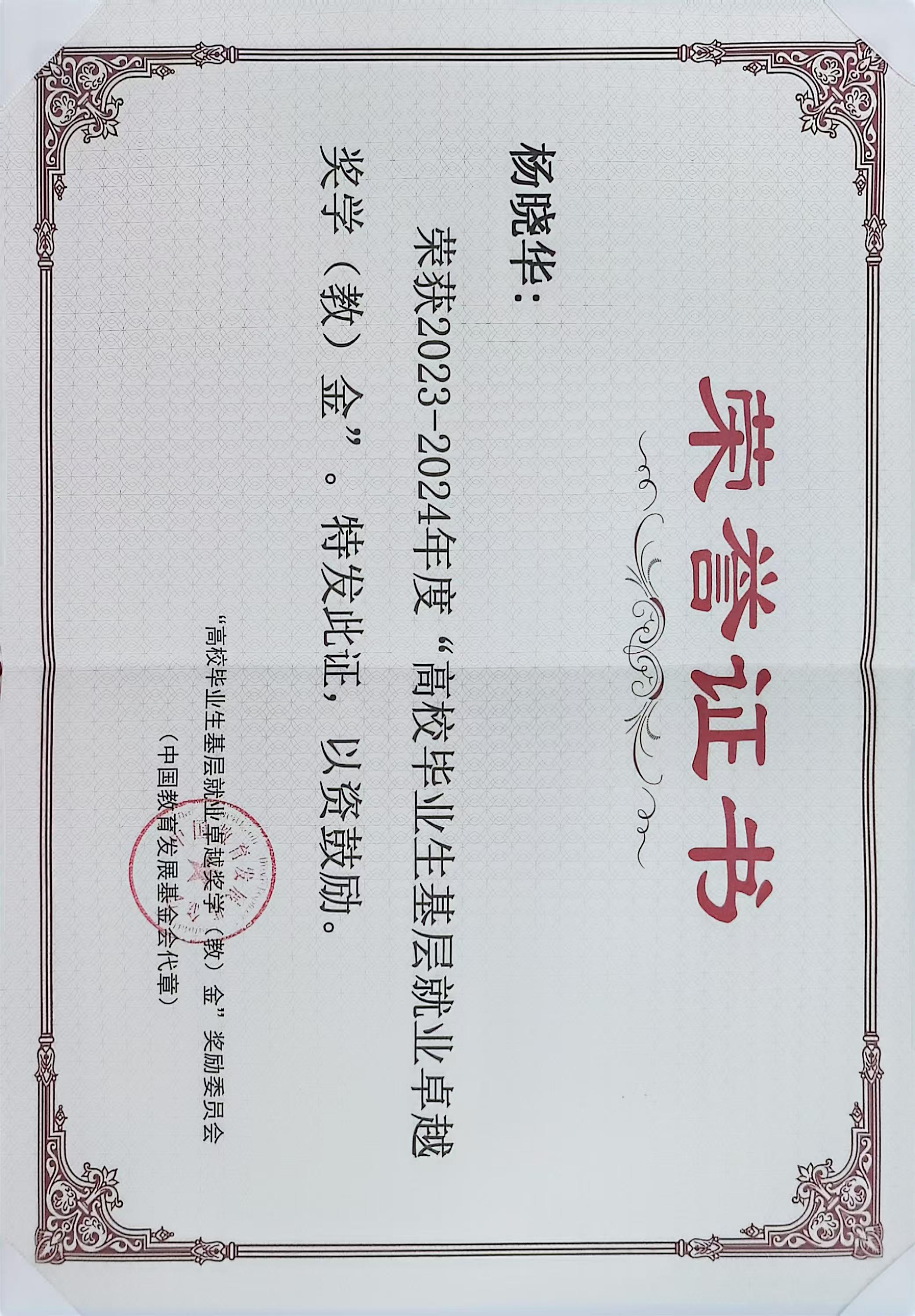 我校毕业生杨晓华荣获2023-2024年度“高校毕业生基层就业卓越奖学(教)金”